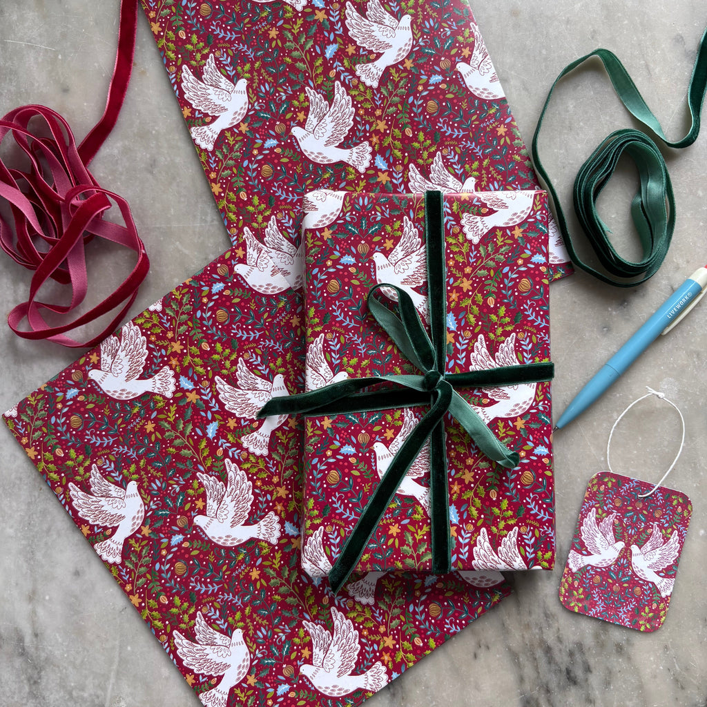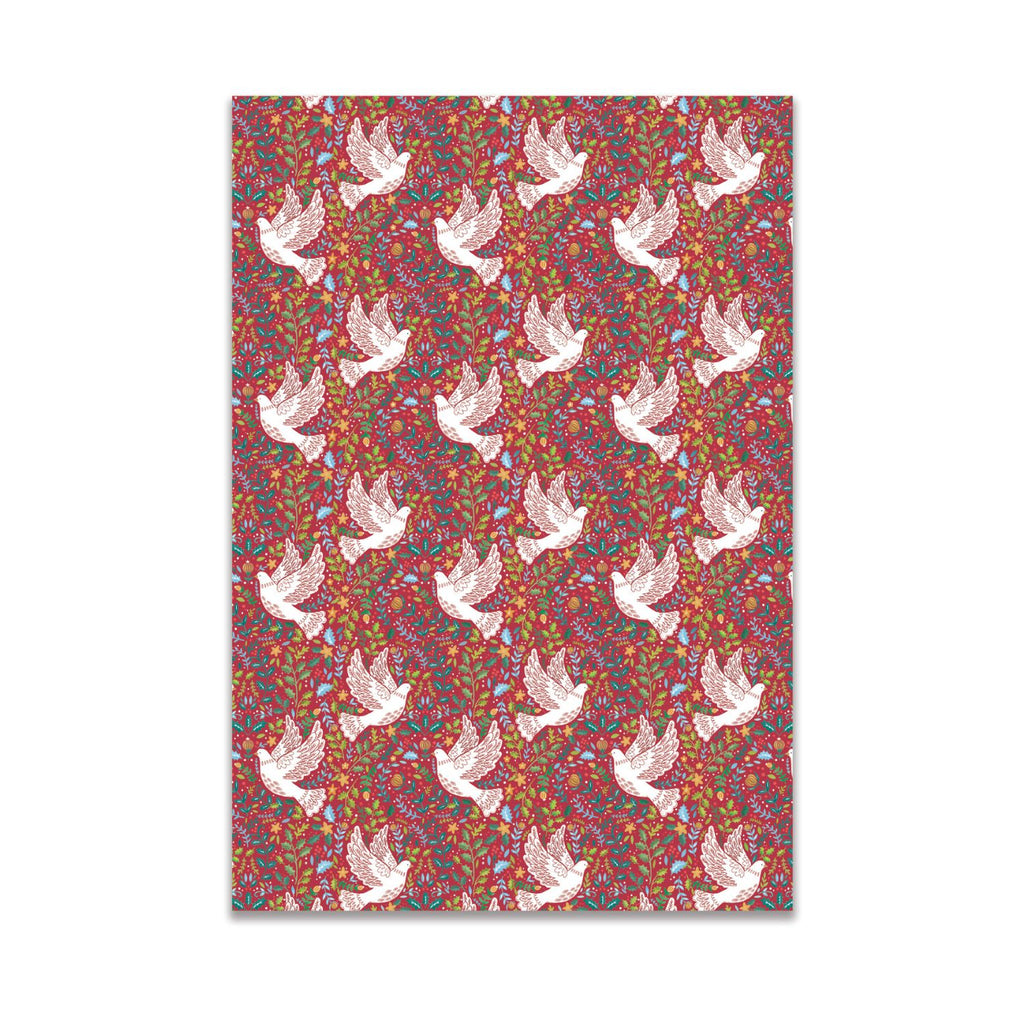 Wrap your gifts in this illustrated gift wrap featuring Doves and botanicals on a rich coloured background.