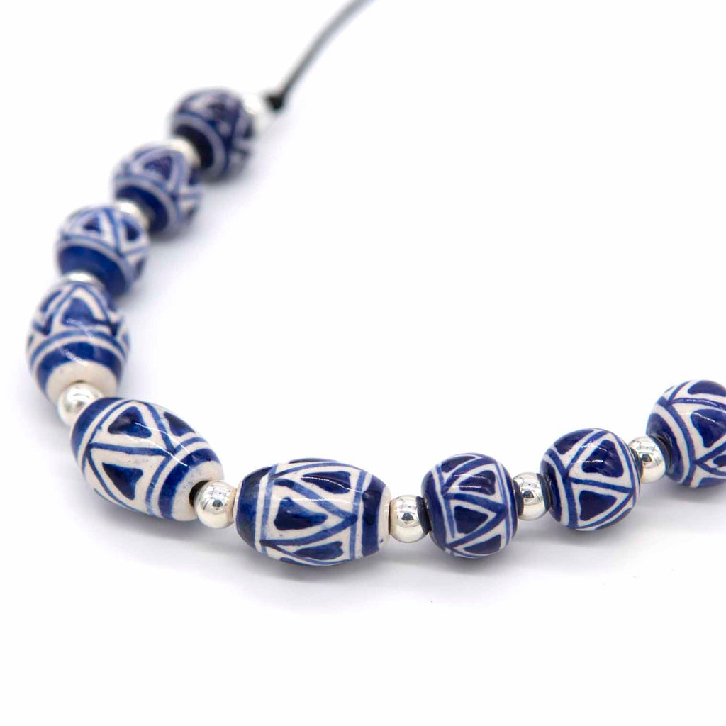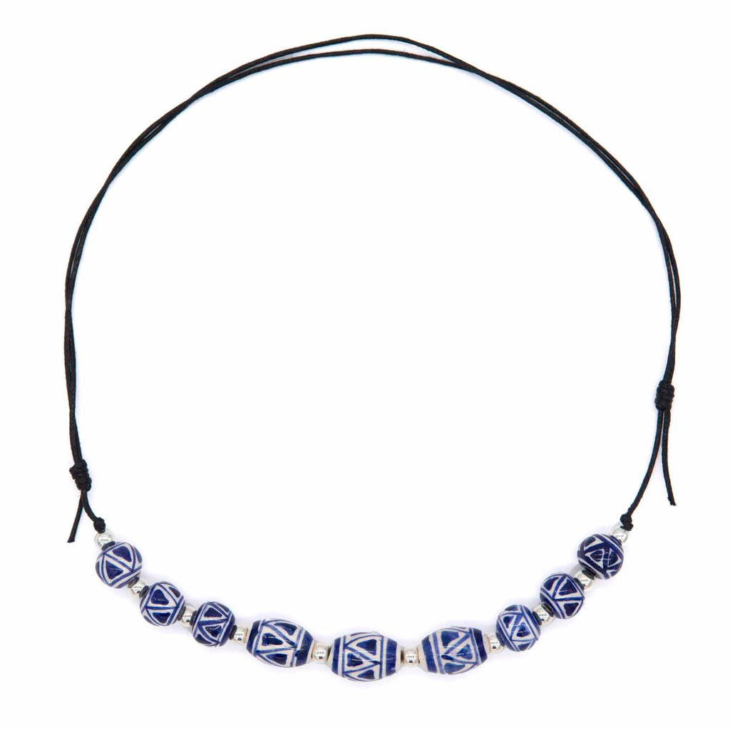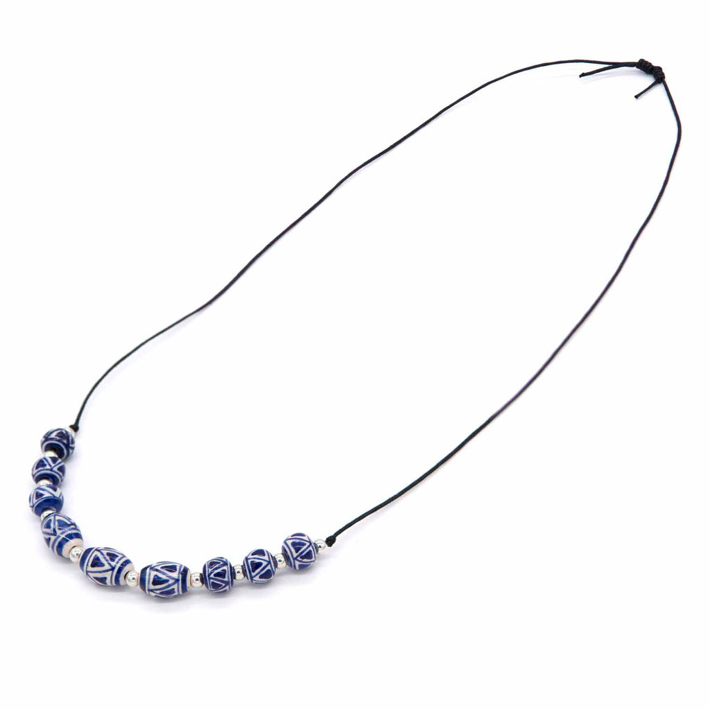 This pretty blue and white necklace has been made from a selection of handmade clay beads from Cusco, Peru, each featuring a hand-painted pattern that reminds of sunny Greece! An adjustable cord allows the wearer to style the necklace long or to wear as a choker.