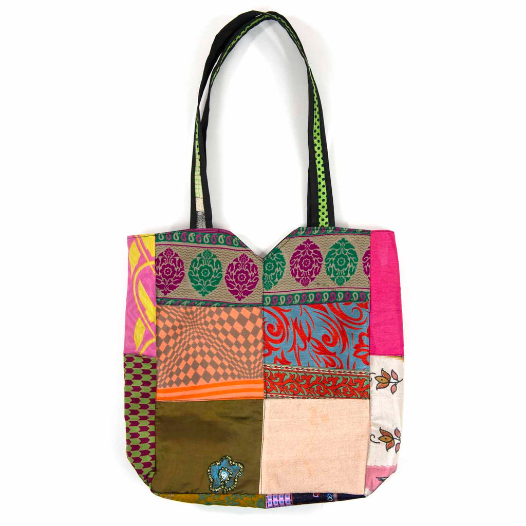 These beautiful, elegant bags are made with remnants of sari fabric to create one of a kind items. Generously sized, the main bag is zipped for extra security. The bag has a 'v' cut detail and an inner zipped compartment for keeping your phone or purse handy.