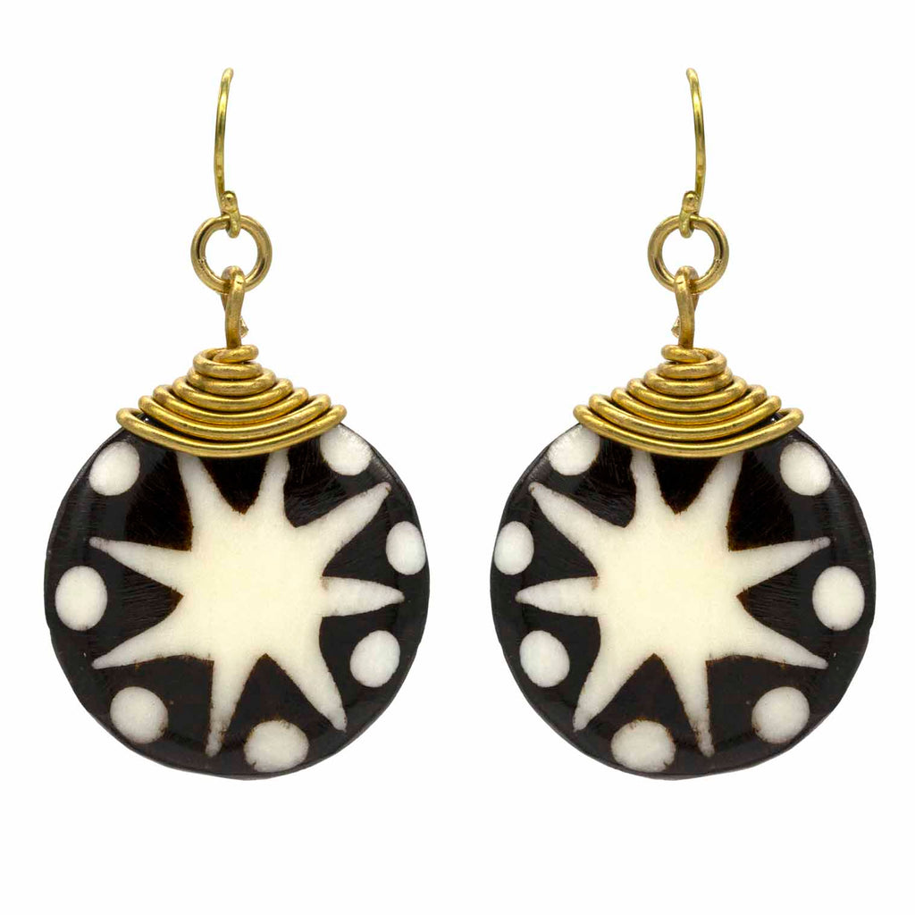 Bold and radiant, these Starburst Batik Earrings feature a striking sunburst design hand-dyed in black and white. Each circular piece is topped with decorative brass wirework, adding a subtle touch of shimmer to this powerful artisan style.