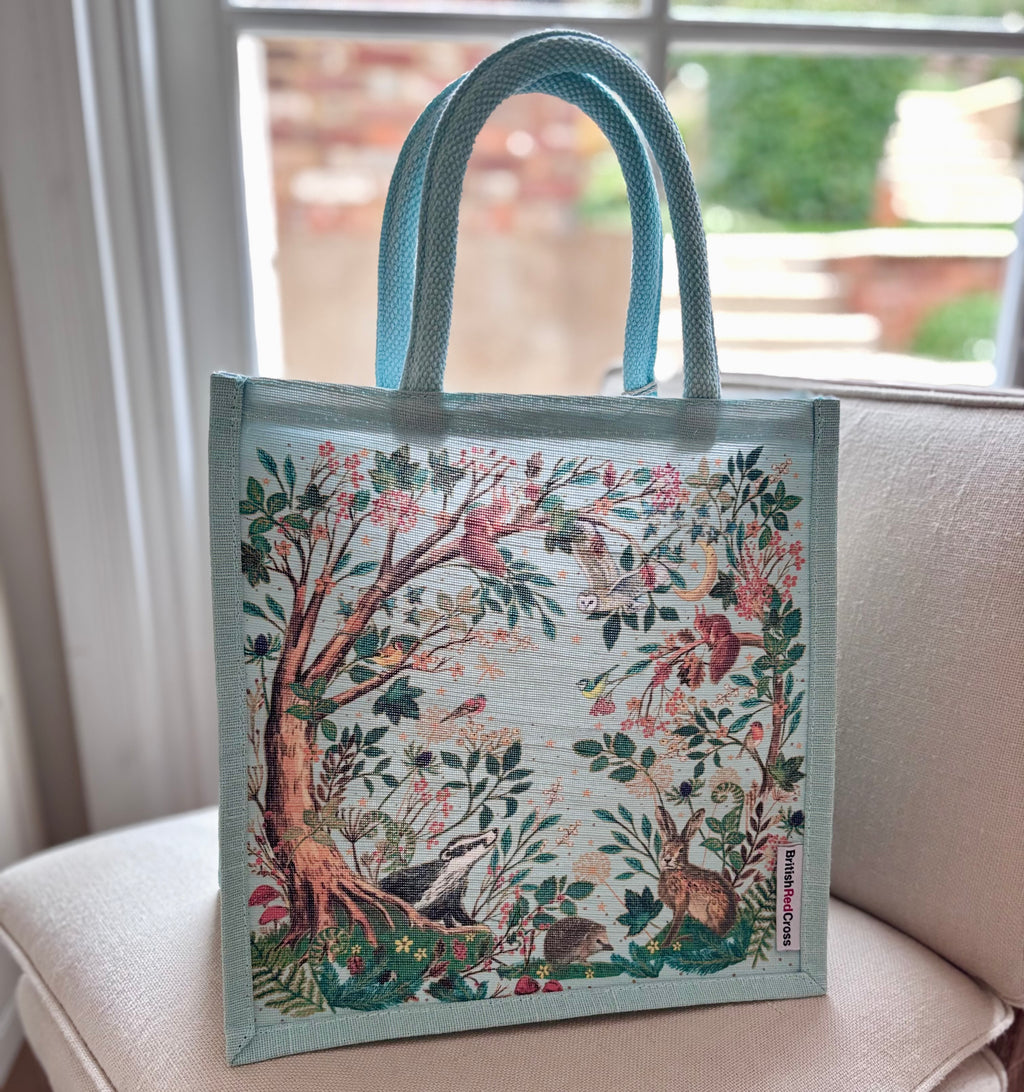 This jute and cotton (juco) shopper features a detailed illustrated woodland scene with squirrels, hare, hedgehog and badger, birds and botanicals. Created as part of a range of goods featuring artwork designed exclusively for British Red Cross by designer Caroline Armstrong. A compact and practical size, it will also make a great gift bag or alternative to a stocking.